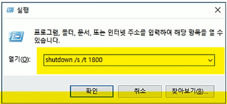 (window+R)실행란에 'shutdown /s /t 1800' or 'shutdown -s -t 1800' 입력