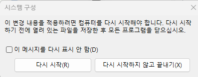 다시 일반 모드로 부팅할려면 안전 부팅 해제하고 다시 시작 클릭.